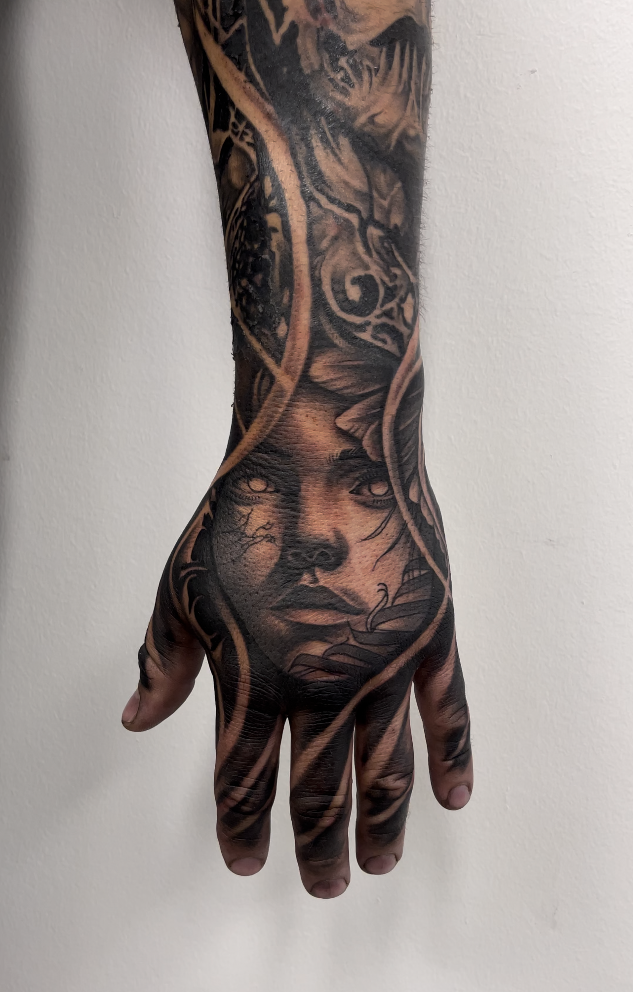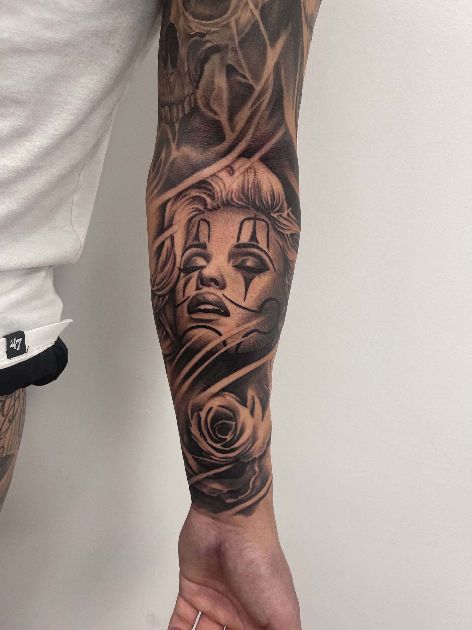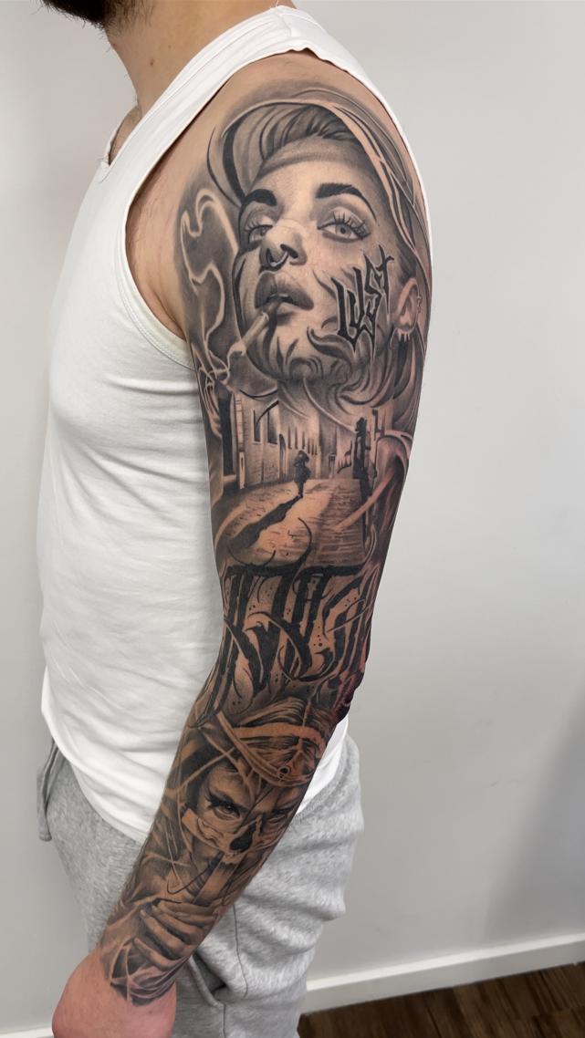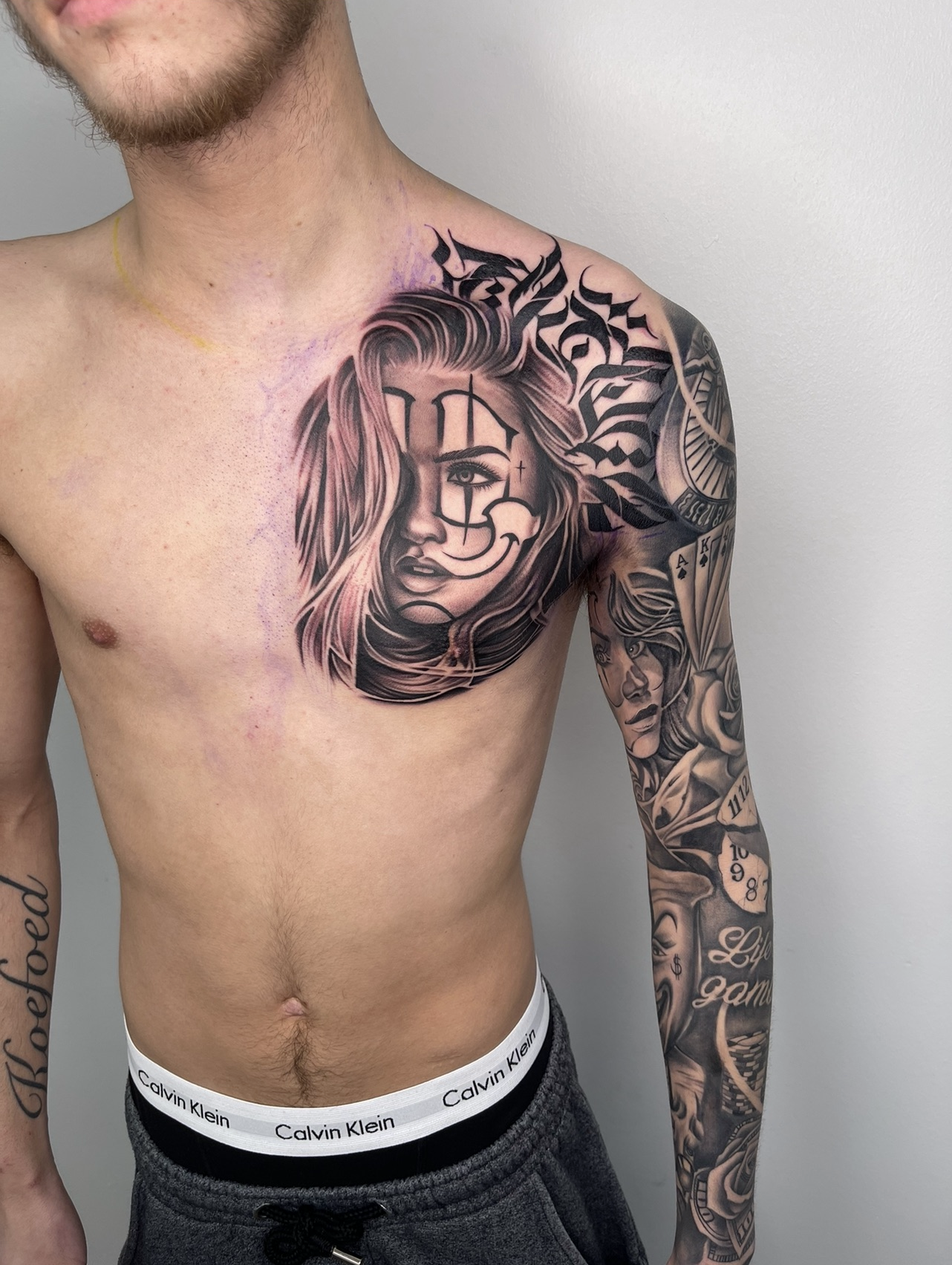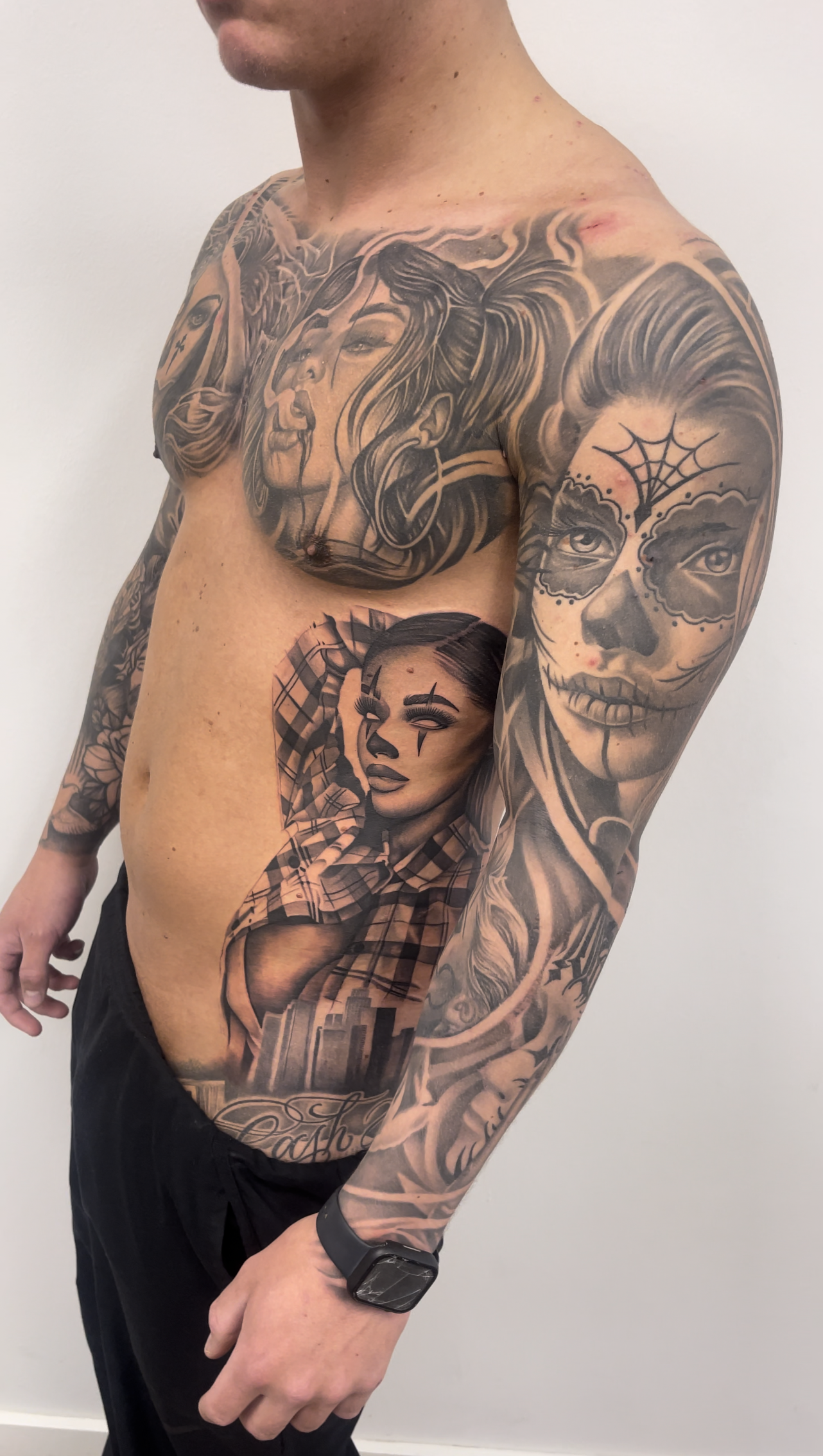 Den stilart jeg arbejder med, er for det meste indenfor realisme black and grey - primært chicano, dame ansigter, skulls og en masse fyld der binder tatoveringen sammen som helhed. Jeg elsker at udfordre mig selv med store projekter som udfolder sig over en hel kropsdel eller endnu bedre; en hel krop.