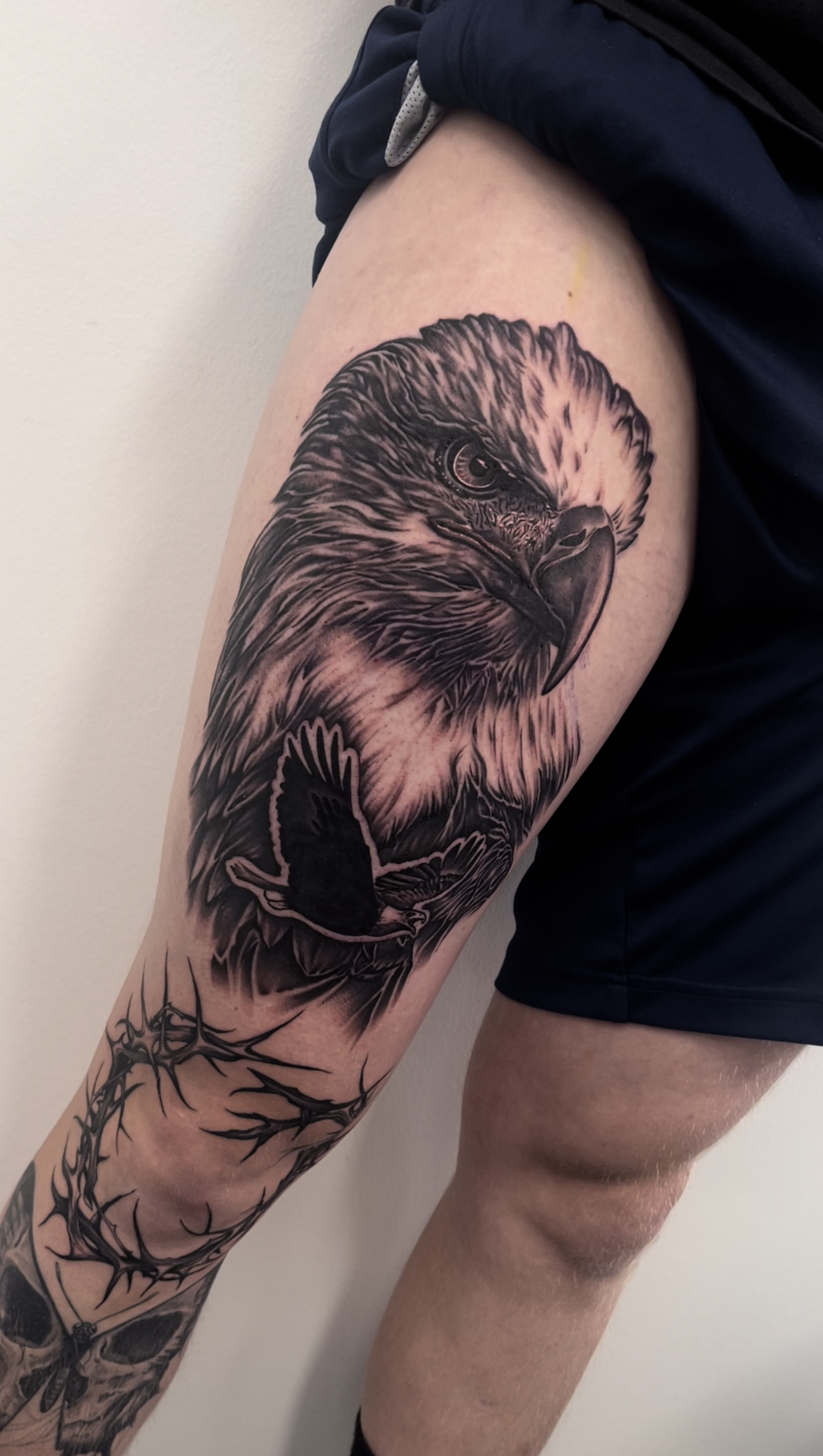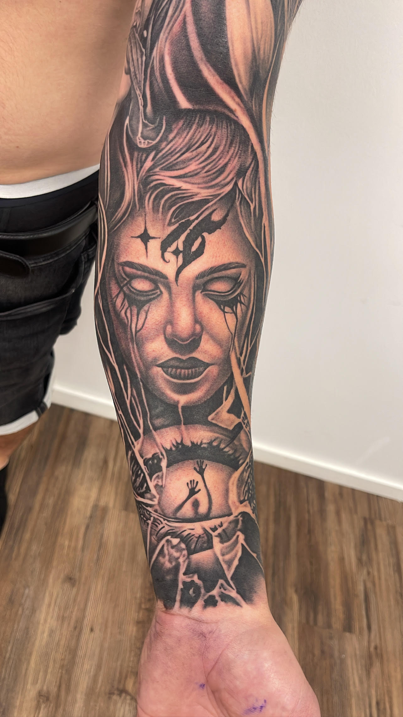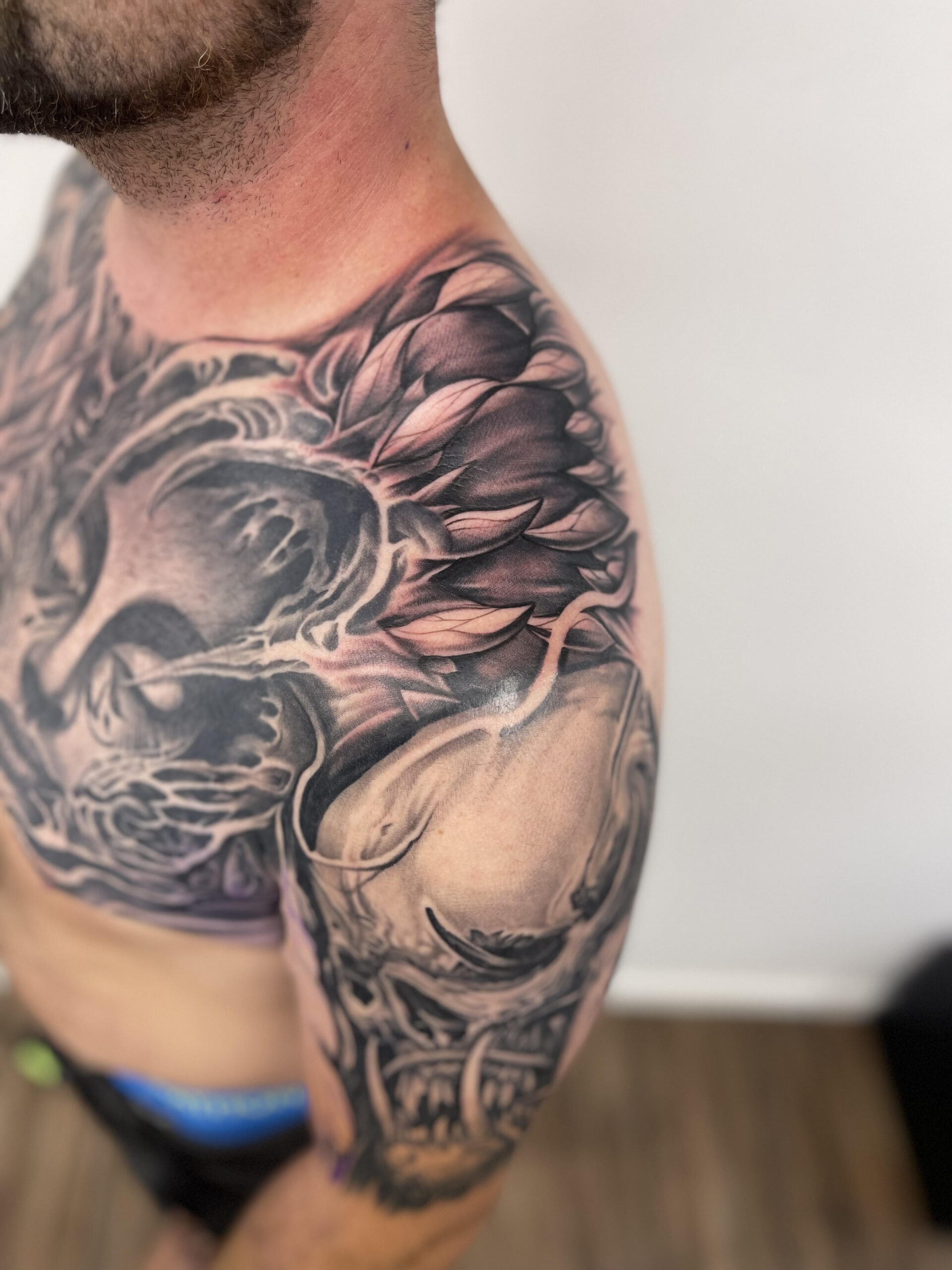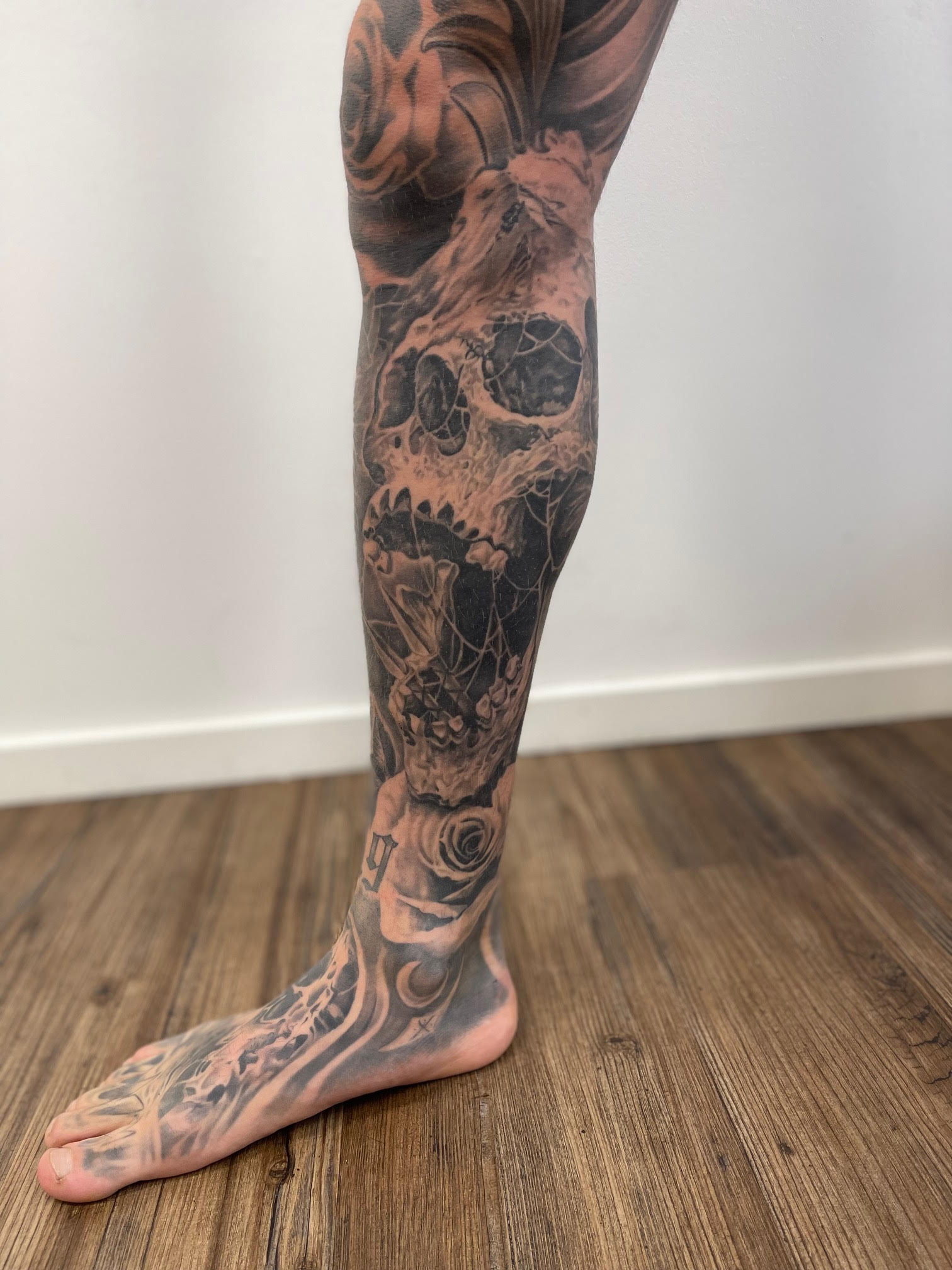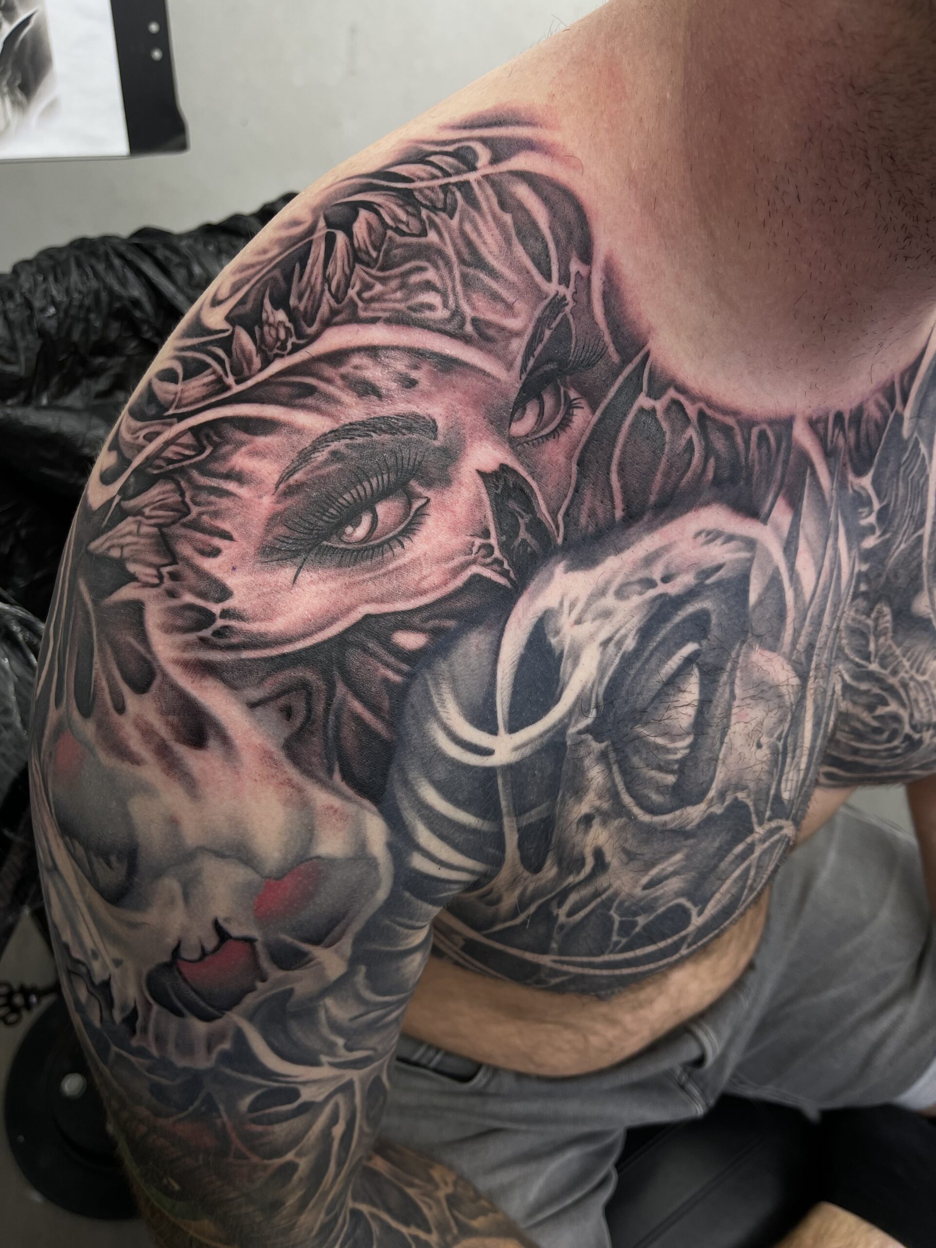 Den stilart jeg arbejder med, er for det meste indenfor realisme black and grey - primært chicano, dame ansigter, skulls og en masse fyld der binder tatoveringen sammen som helhed. Jeg elsker at udfordre mig selv med store projekter som udfolder sig over en hel kropsdel eller endnu bedre; en hel krop.